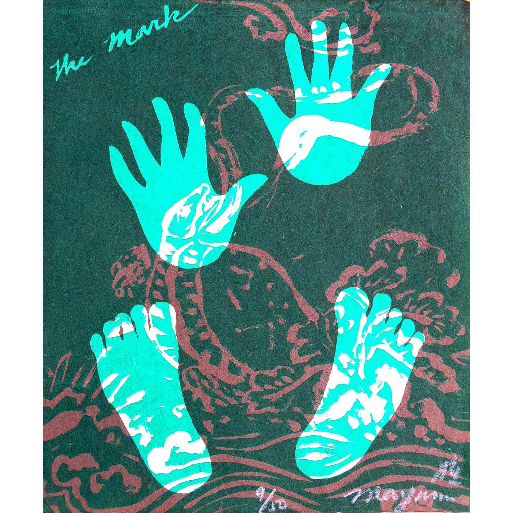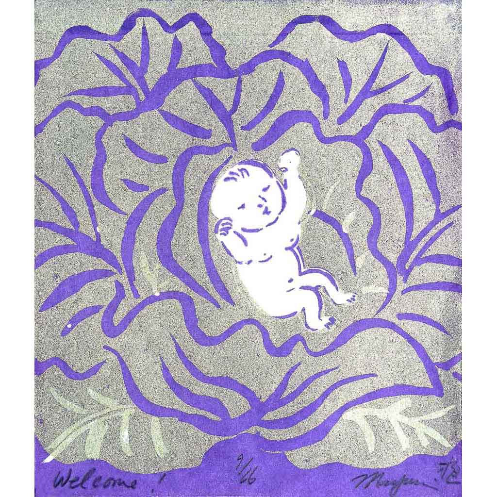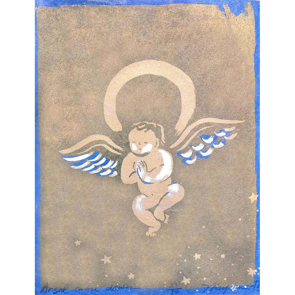 Babies and angels are my favorite creatures. There were four babies born in my Muir Beach home. I wanted to create something special for these babies and their mothers, a gift that no one else could give. Living in a communal setting has been my life for a long time. Allowing people to bring their children to work has been a way for me to support women, especially single mothers who would not be able to work otherwise. The handprints and footprints used in the art are from the actual babies who lived with us.