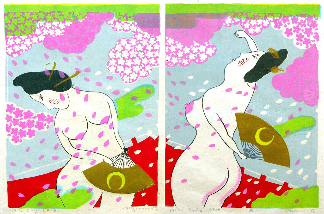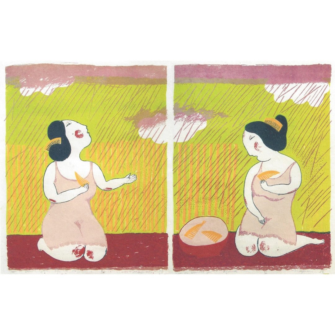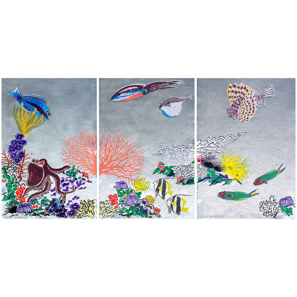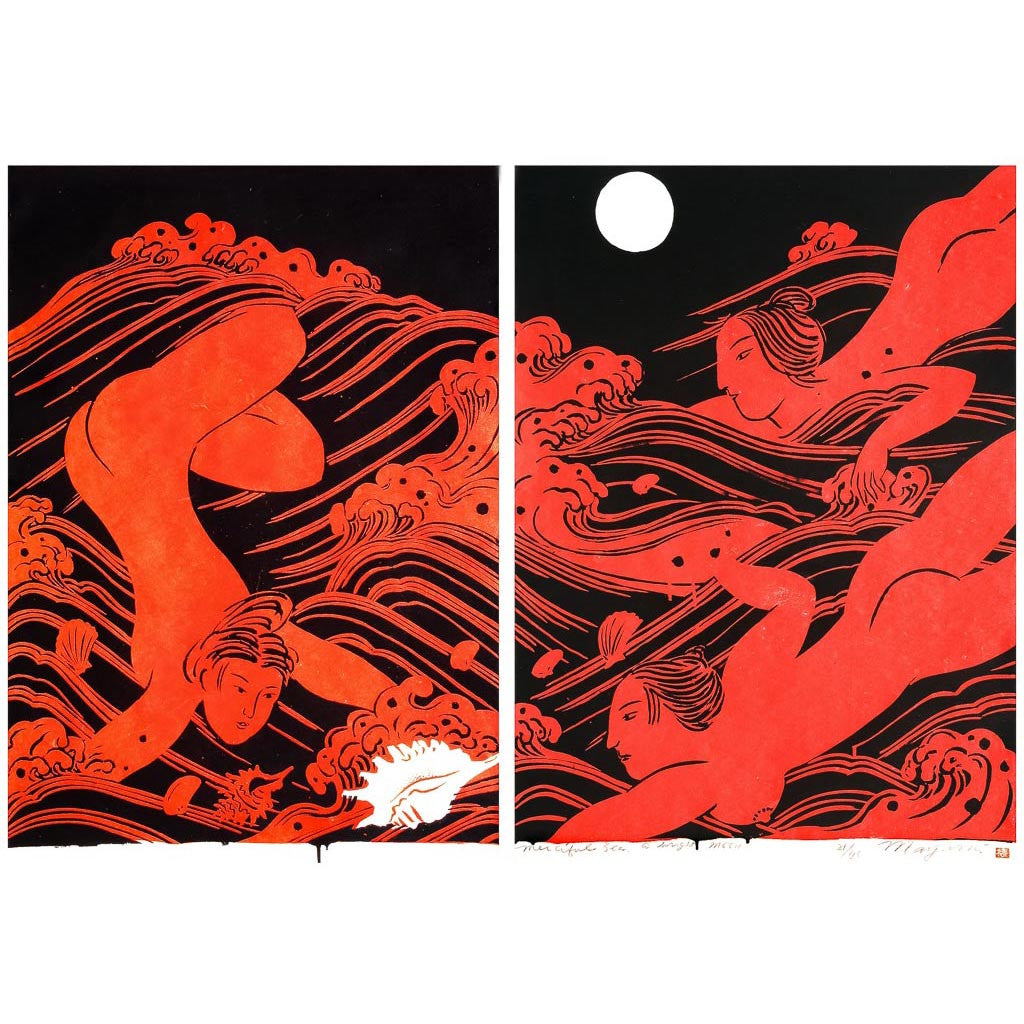 Once I learned the silk screening technique, I loved how you can use colors so freely. I started to look back into traditional Japanese woodblock prints, ukiyo-e, and I was so inspired with their use color. I love Harunobu, Hokusai, and Kuniyoshi. During their time, they would create larger prints by joining two or three sheets of paper into diptychs and triptychs. Since I needed to create larger works for Print Exhibition like the International Tokyo Print Biennial, I thought that it would be fun to do larger artworks in this traditional manner.