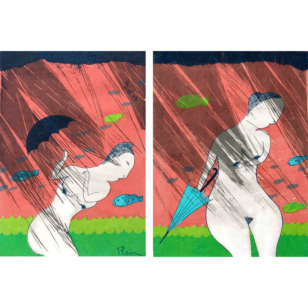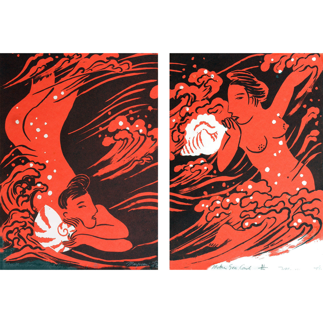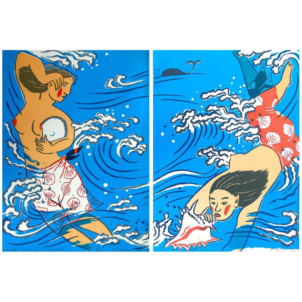 Once I learned the silk screening technique, I loved how you can use colors so freely. I started to look back into traditional Japanese woodblock prints, ukiyo-e, and I was so inspired with their use color. I love Harunobu, Hokusai, and Kuniyoshi. During their time, they would create larger prints by joining two or three sheets of paper into diptychs and triptychs. Since I needed to create larger works for Print Exhibition like the International Tokyo Print Biennial, I thought that it would be fun to do larger artworks in this traditional manner.