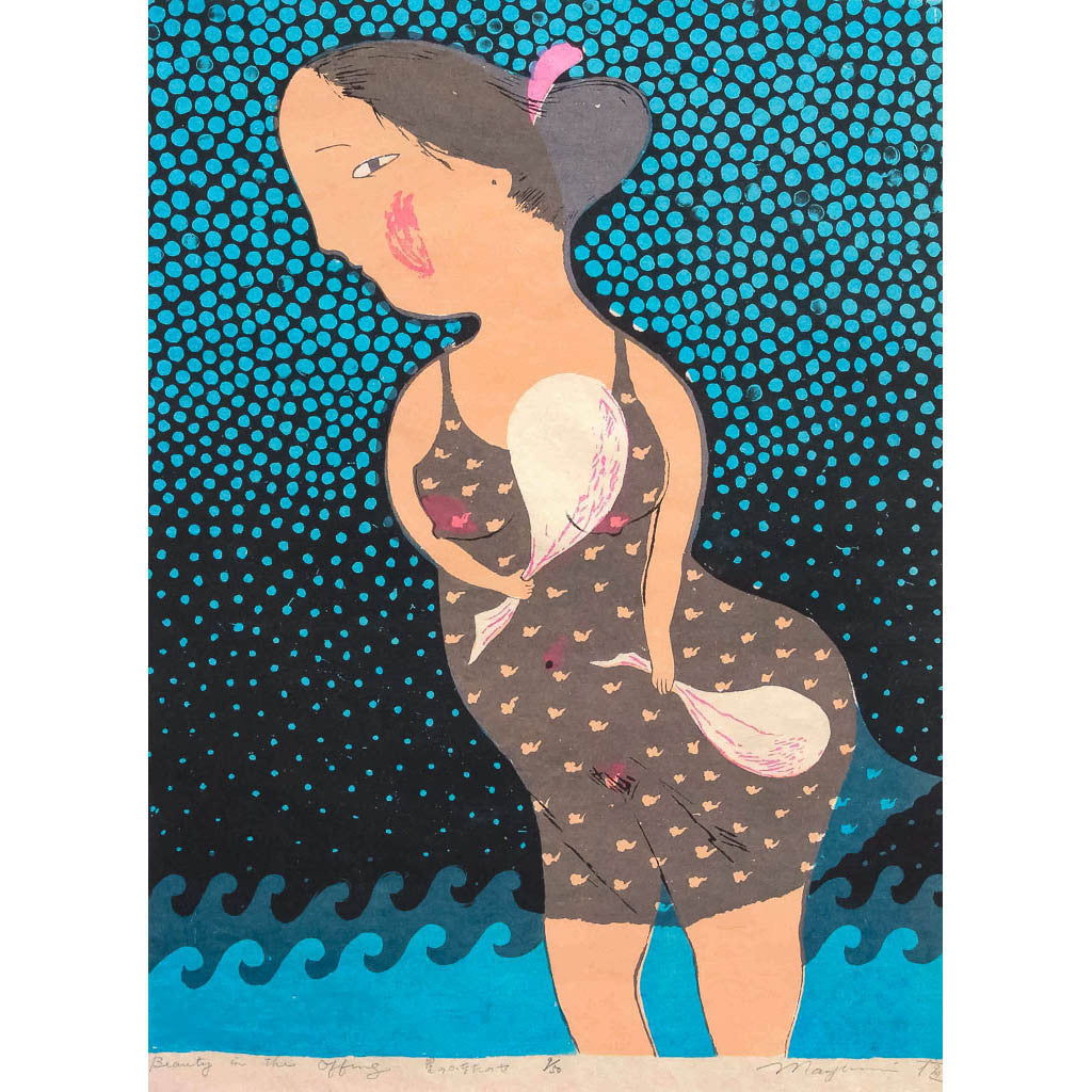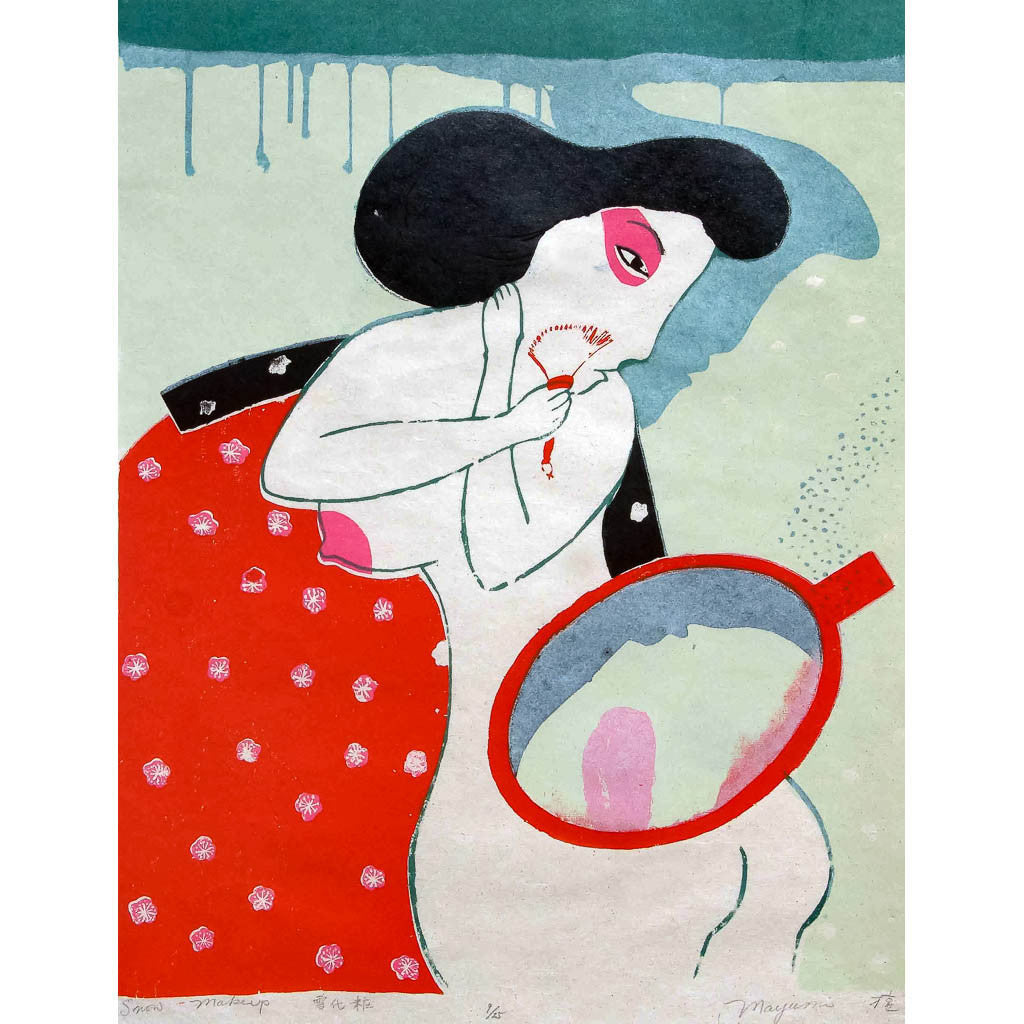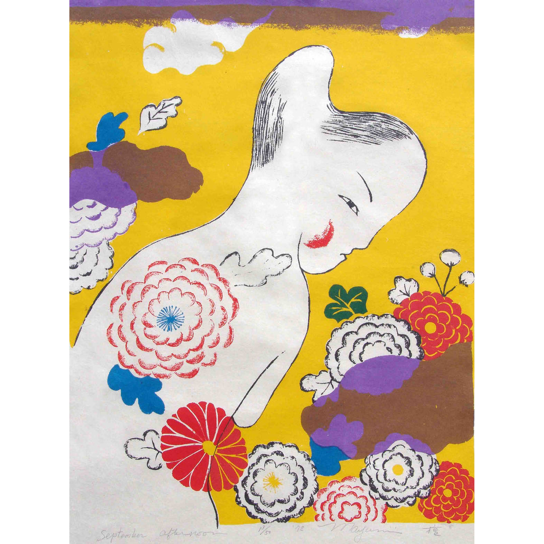 A small print from the Woman Calendar Series was the first silkscreen that I ever printed. I was fascinated by working with color, and I drew upon my background as a fabric major. The silkscreen technique was similar to working with color over fabric. Traditional Japanese kimono design and patterns from lacquer wares combined with my feeling for each season brought this series to life. It was almost like a pictorial diary of how I thought of the calendar, the activites and beauty of each season.