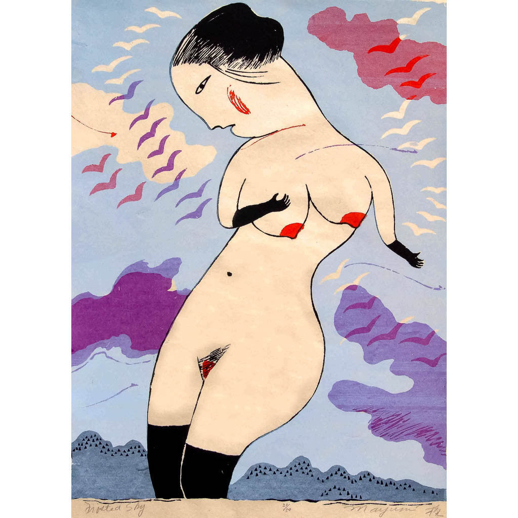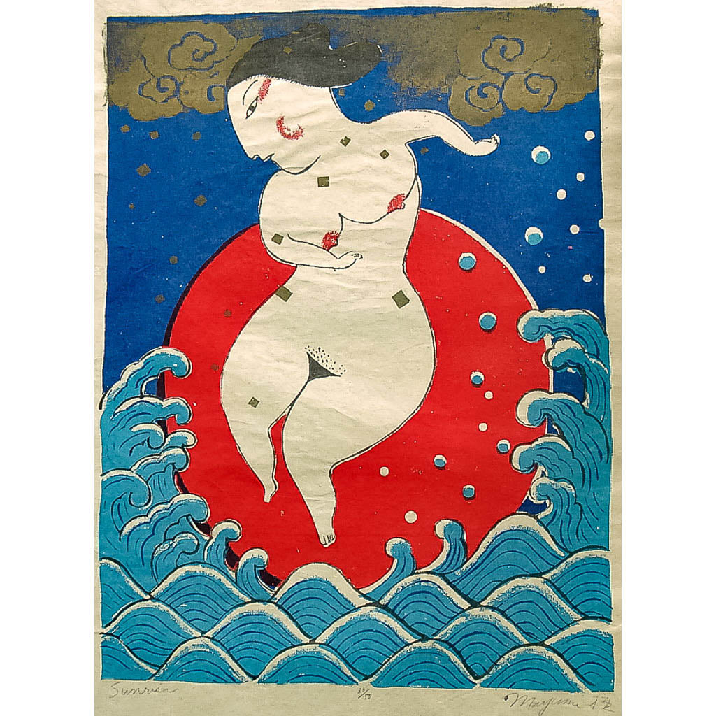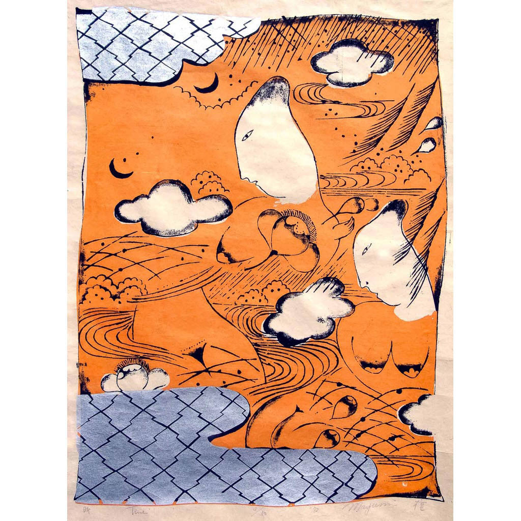 A small print from the Woman Calendar Series was the first silkscreen that I ever printed. I was fascinated by working with color, and I drew upon my background as a fabric major. The silkscreen technique was similar to working with color over fabric. Traditional Japanese kimono design and patterns from lacquer wares combined with my feeling for each season brought this series to life. It was almost like a pictorial diary of how I thought of the calendar, the activites and beauty of each season.